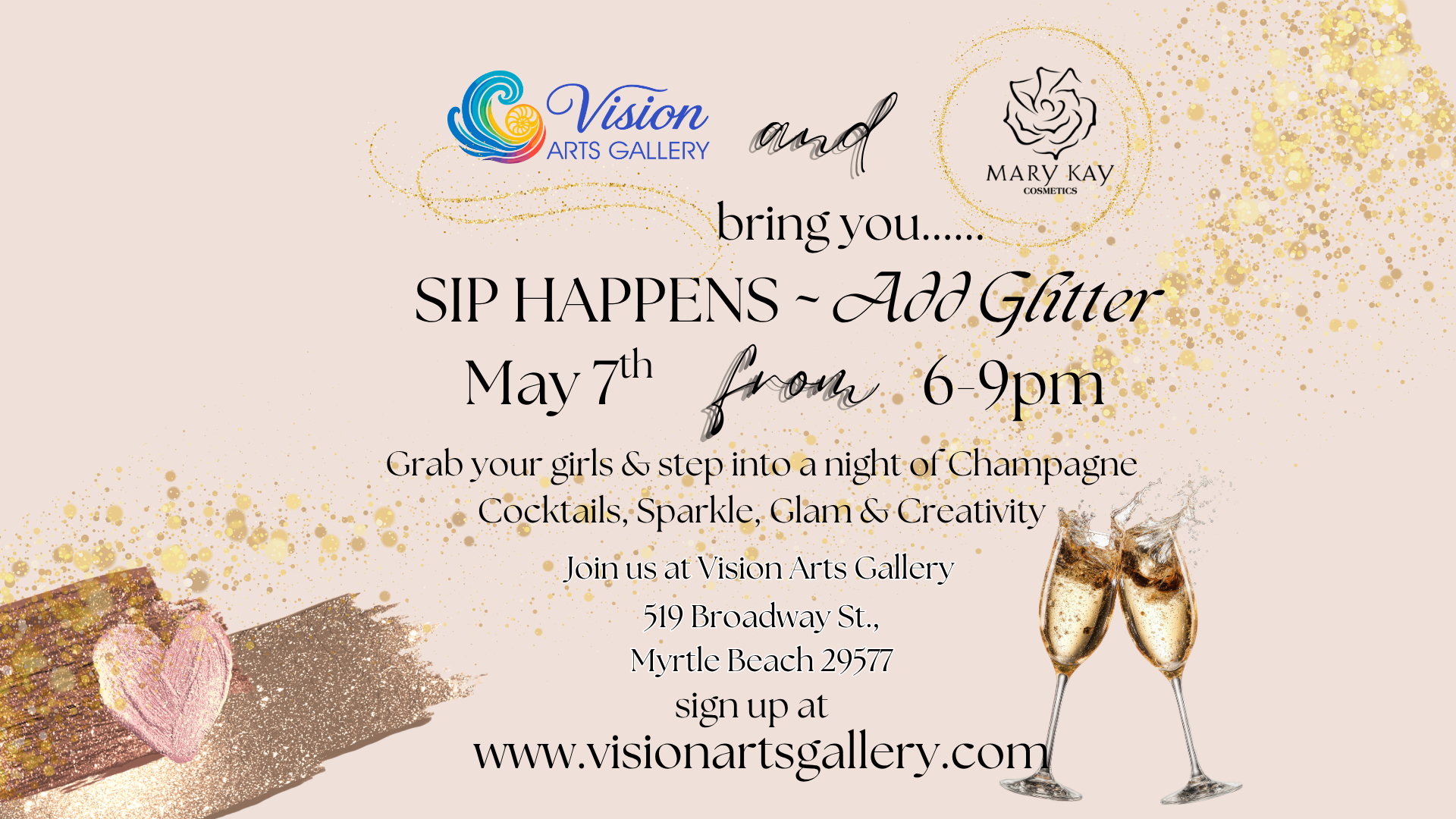 Join us for Sip Happens… Add Glitter, a glamorous ladies night out filled with sparkle, sips, and a touch of indulgence. Whether you’re celebrating friendship, treating yourself, or just ready for a night that shines a little brighter, this experience was made for you.